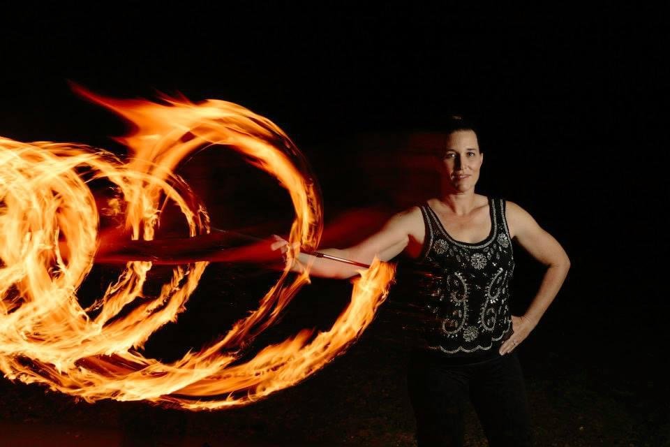 Fire Baton Performance – A dramatic display of skillful twirling and spinning that uses controlled flames to create stunning light trails and dynamic movement perfect for outdoor night events.